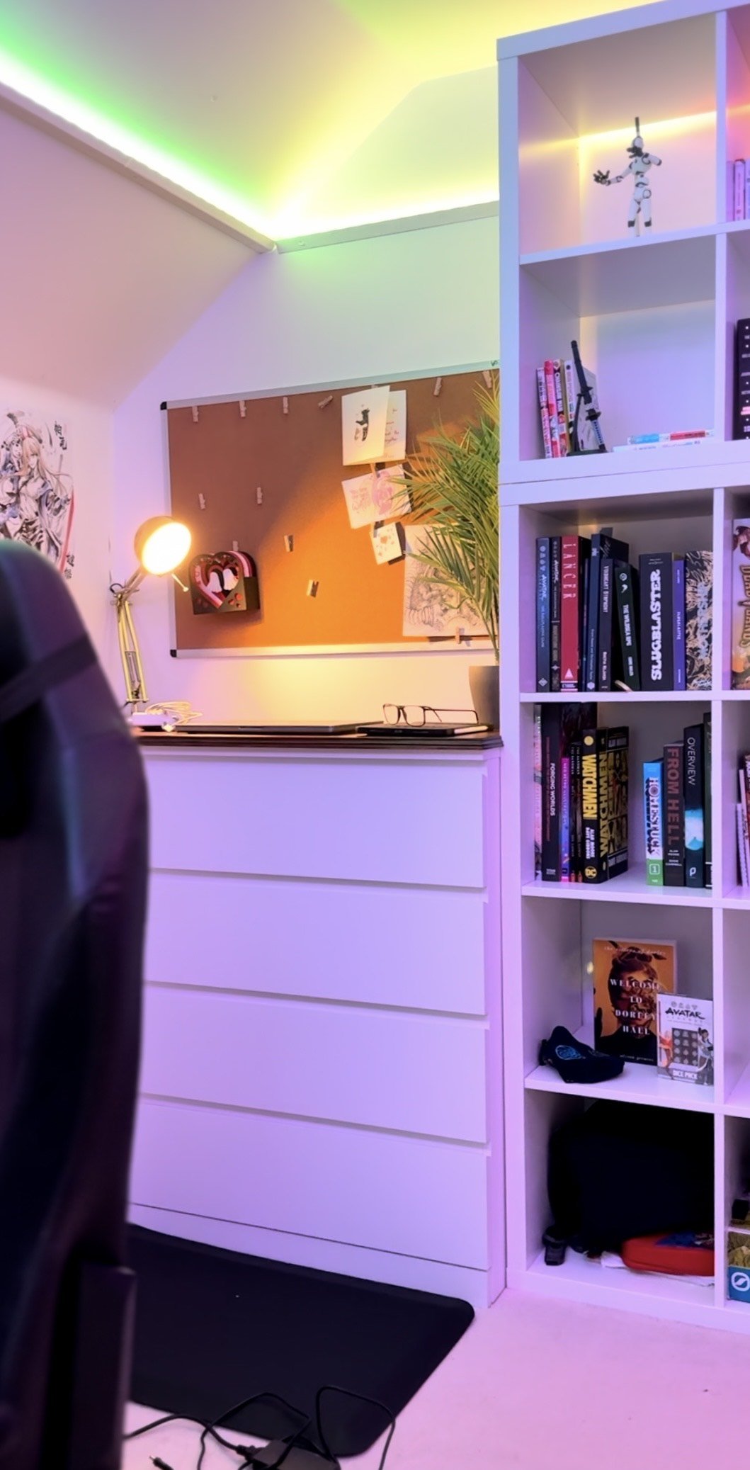 Wireless RGB lighting was added to the entirety of the room, elevating this office and gaming space to the next level