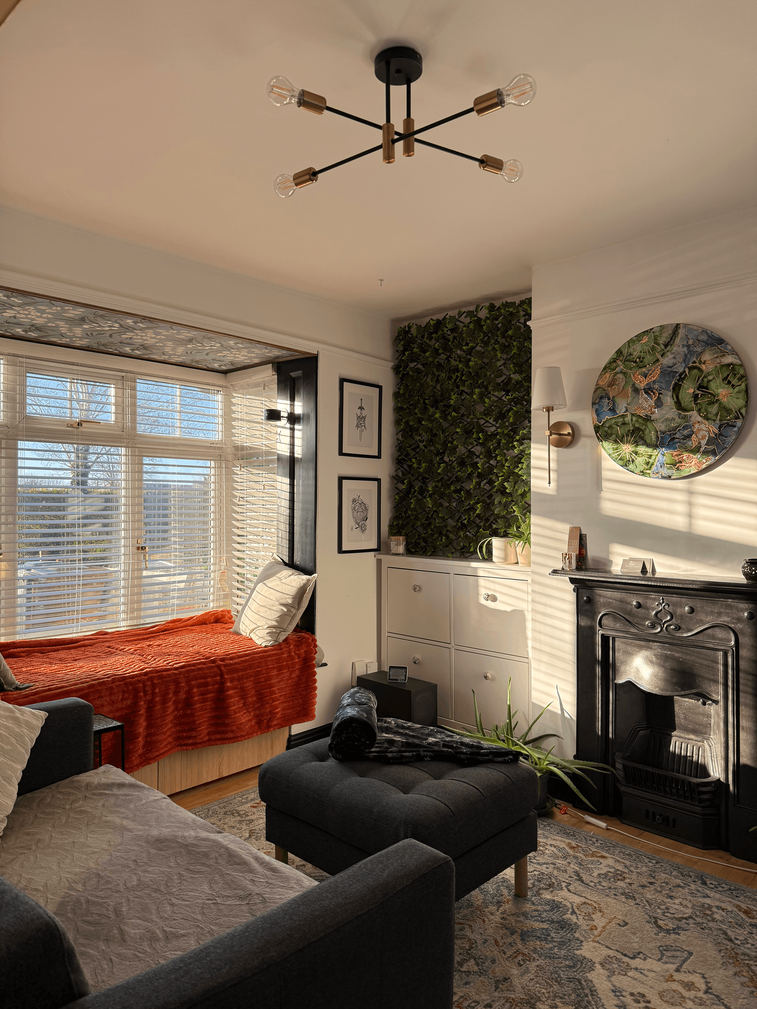 Above the day bed, walnut-stained ceiling panelling was introduced to frame the seating zone and highlight the textured flora and fauna wallpaper. This detail adds warmth, depth, and a sense of intimacy, visually anchoring the space.