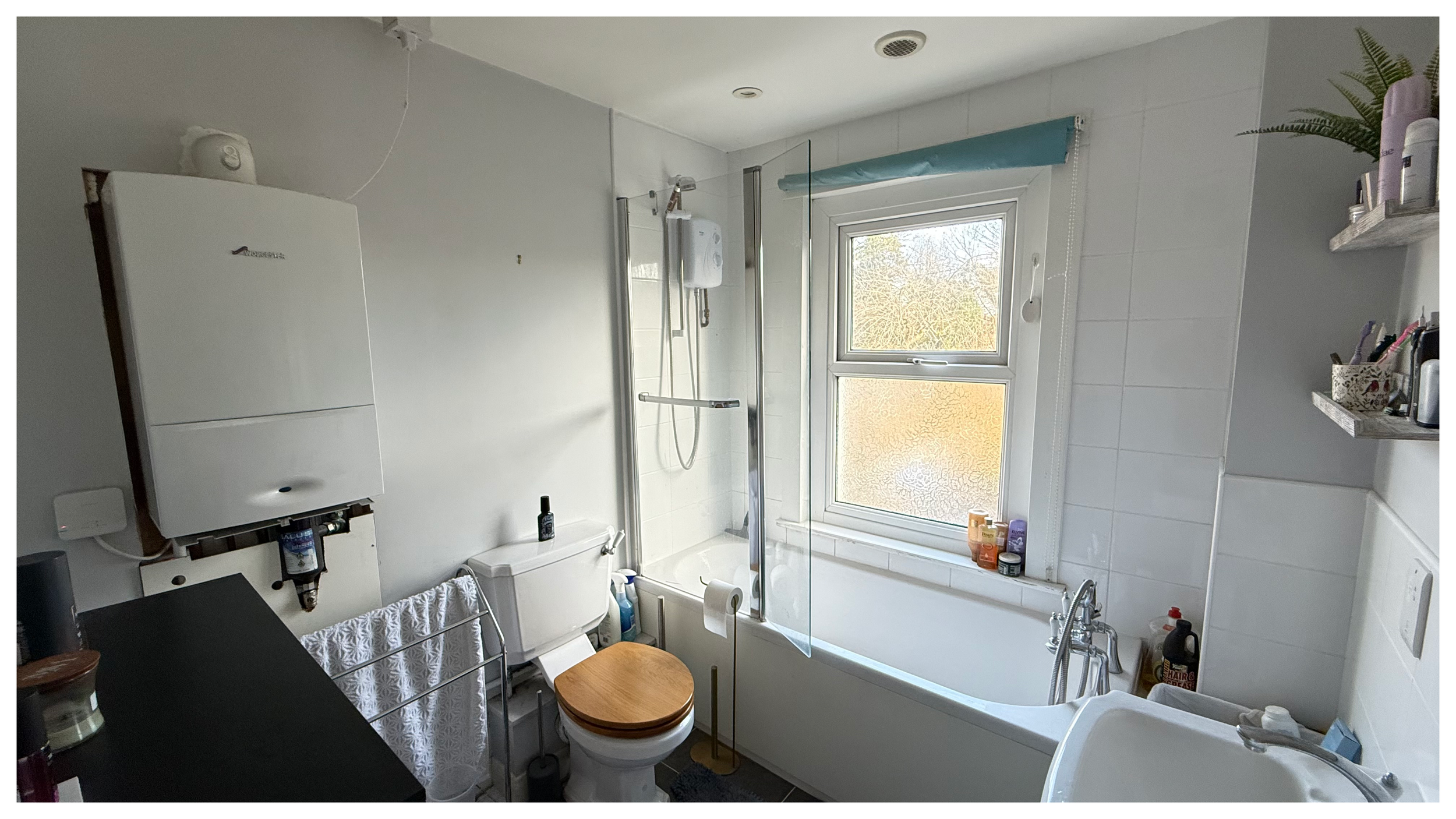 A single glass screen separates the wet area from the dry. Custom tall storage with frosted glass fronts was fitted around the boiler. To round off the theme, the wall opposite the shower was converted to a dramatic feature using panelling work and sophisticated wallpaper with deep complimentary tones.